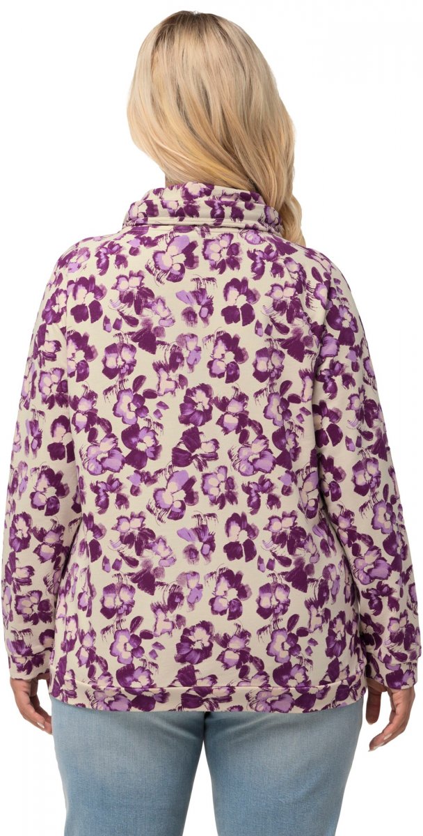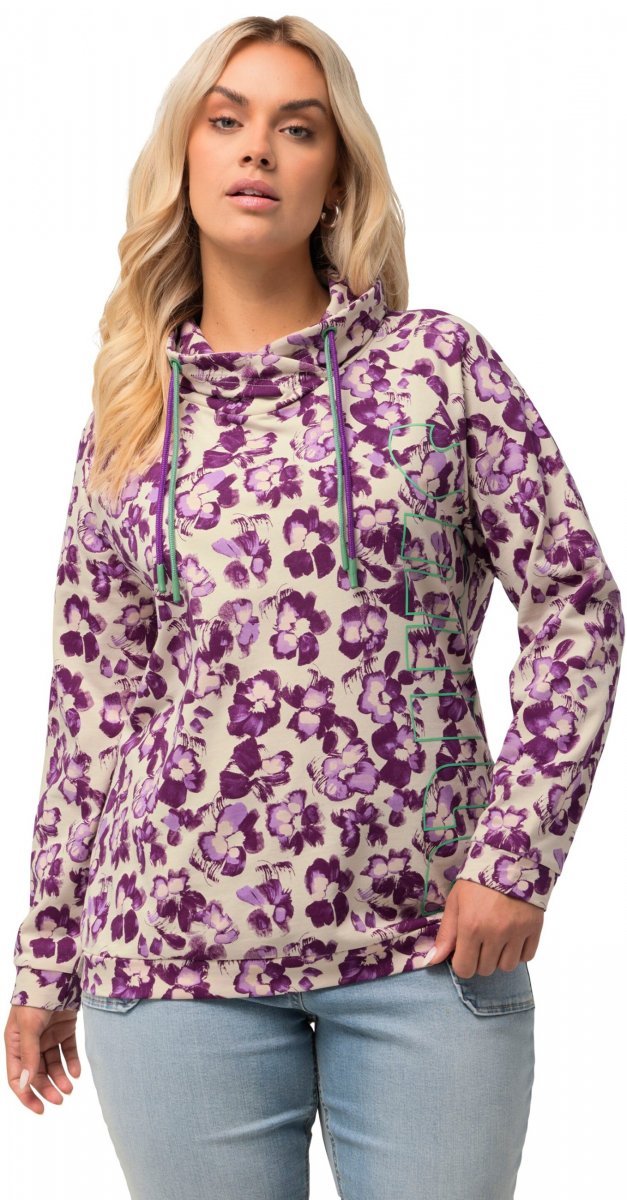 Ulla Popken Floral Print Drawstring Collar Hoodie Vanilla