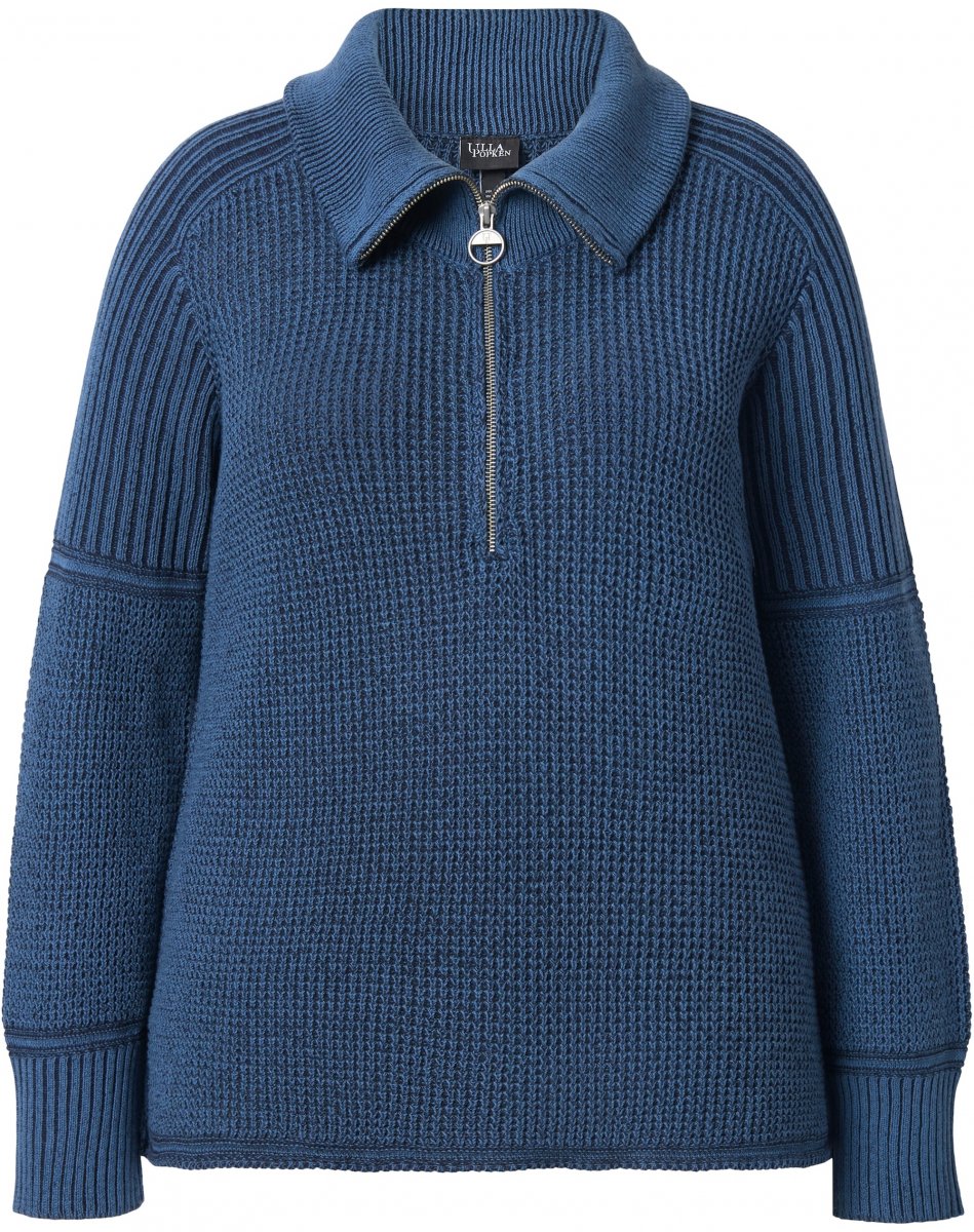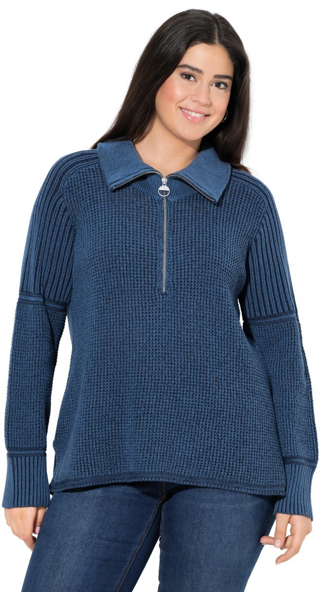 Ulla Popken Two-Tone Mixed Knit Troyer Collar Sweater Navy